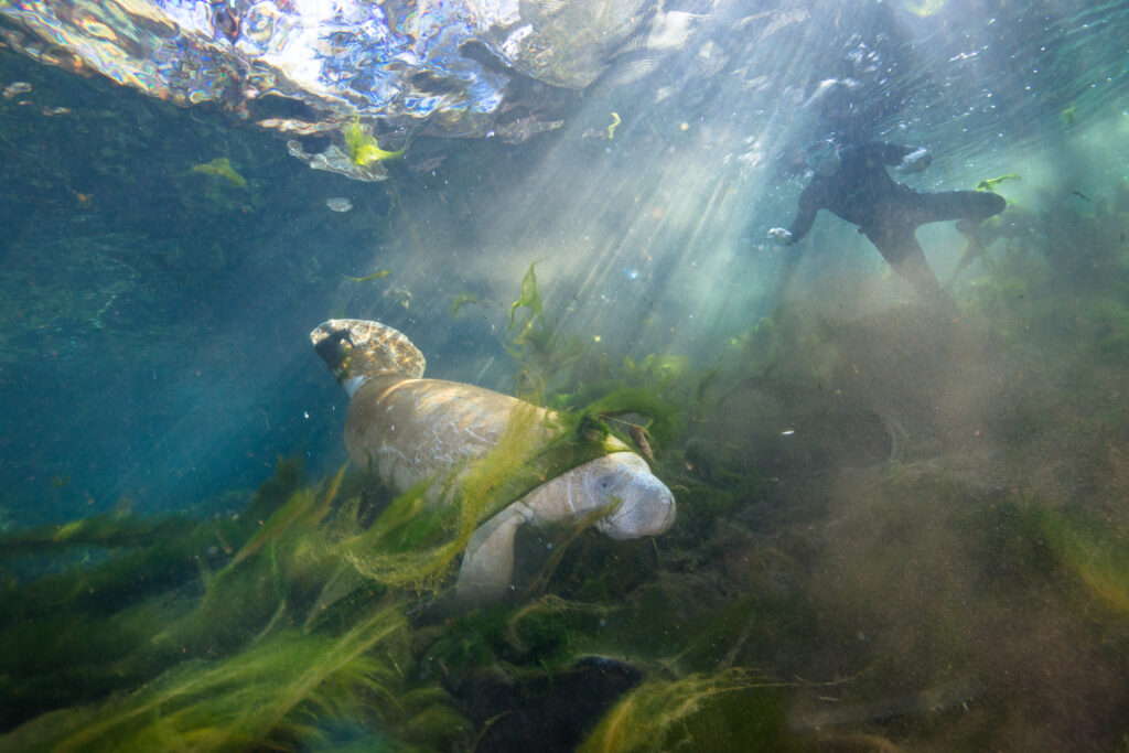 Like many of Florida’s springs, the eelgrass and other native vegetation at Manatee Springs has been overgrown and displaced by toxic green algae, seen ensconcing a manatee searching for food as observed from above.
